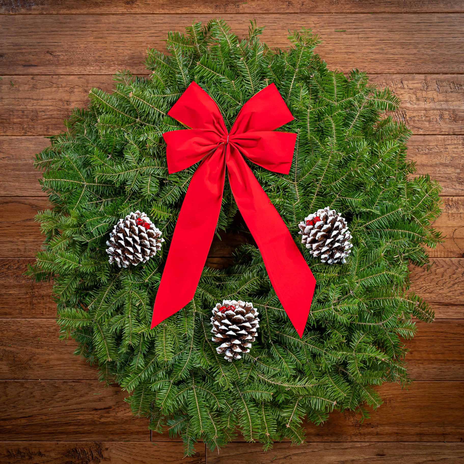 These elegant Victorian wreaths feature a gold-trimmed, wired satin bow with seven lavish loops and long flowing tails. Large natural pinecones, gold jingle bells, and sparkling ornament sets complete the look.
