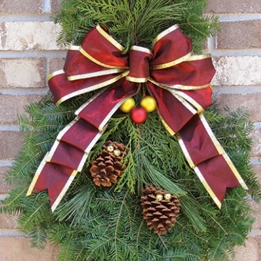This graceful spray is adorned with a gold-trimmed, wired satin bow featuring seven lavish loops and long flowing tails. Natural pinecones, gold jingle bells, and ornament sets add a touch of timeless Victorian elegance.