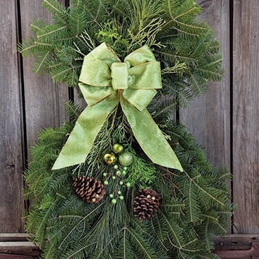 These wintergreen wreaths feature a lush green velveteen bow and are accented with sparkling cedar trimmings. Bronzed pinecones laced with gold jingle bells complete this elegant and festive holiday design.